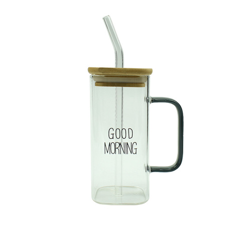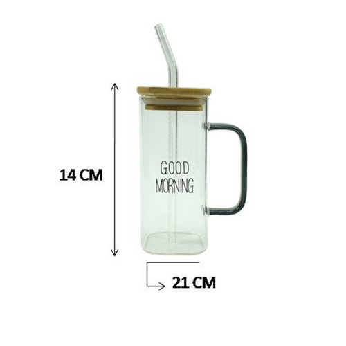 ماگ لیوان اسموتی نی دار درب بامبو شیشه ای ظریف دارای واشر درب برای جلوگیری از ریزش مایعات دارای نی شیشه ای با کیفیت حک رویه محصول good morning , و مربعی و دسته دار میباشد.