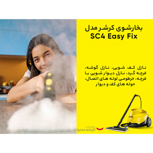 بخار شوی SC4 ایزی فیکس کارچر از جمله بهترین تولیدات این کمپانی در زمینه تولید بخارشوی است. این مدل برای تمیز کردن سطوح مختلف طراحی شده است و به خوبی میتواند محیط را عاری از هرگونه باکتری کند. همچنین نصب و جدا سازی حوله به نازل زمین در بخارشوی SC4 ایزی فیکس کارشر به راحتی و در کمترین زمان ممکن و بدون دخالت دست هم صورت میگیرد و چون مجهز به محفظه نگهداری سیم برق و محل قرار گیری لوازم جانبی است بسیاری از کسانی که دوست دارند از بخارشوی در نظافت منزل استفاده کنند بر روی این مدل از بخارشوی کارشر همنظر هستند. 2 هزار وات توان حرارتی، 3.2 بار قدرت پرتاب، شلنگ 2 متری،سیم 4 متری، مخزن یدکی، سیستم رسوب زدایی، سوپاپ اطمینان، کنترل جریان بخار و... از جمله مشخصات این مدل است که با مقایسه آن با سایر مدلهای کارشر کاربر را میتواند به این نتیجه برساند که در انتخاب خود اشتباه نکرده است و یکی از بهترین گزینههای بخارشوی کارشر را با خود به خانه میبرد.